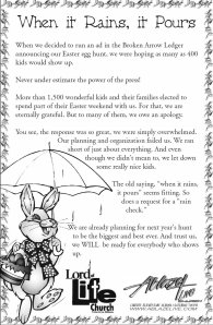 We made a few mistakes with the hunt in 2007. I’d gather that anywhere from 1,500-2,000 people showed up and we were only expecting 1,000 at the most. We didn’t want to turn people away and yet, our building could not contain the crowds. We learned a lot of hard lessons that year. This event failed on many levels. There was a crowd gathering outside while we were worshipping inside and even though people were stationed out there to guard the eggs families were lining up, a child yelled “go” and like that, all 8,000 eggs were gone. We learned a lot that year. We learned that we needed to be 100% outside. We learned to shorten the service. We learned to combine this with a food drive, to equip team members with walkie talkies, and to have security present. Did the results of this event keep us from trying again?